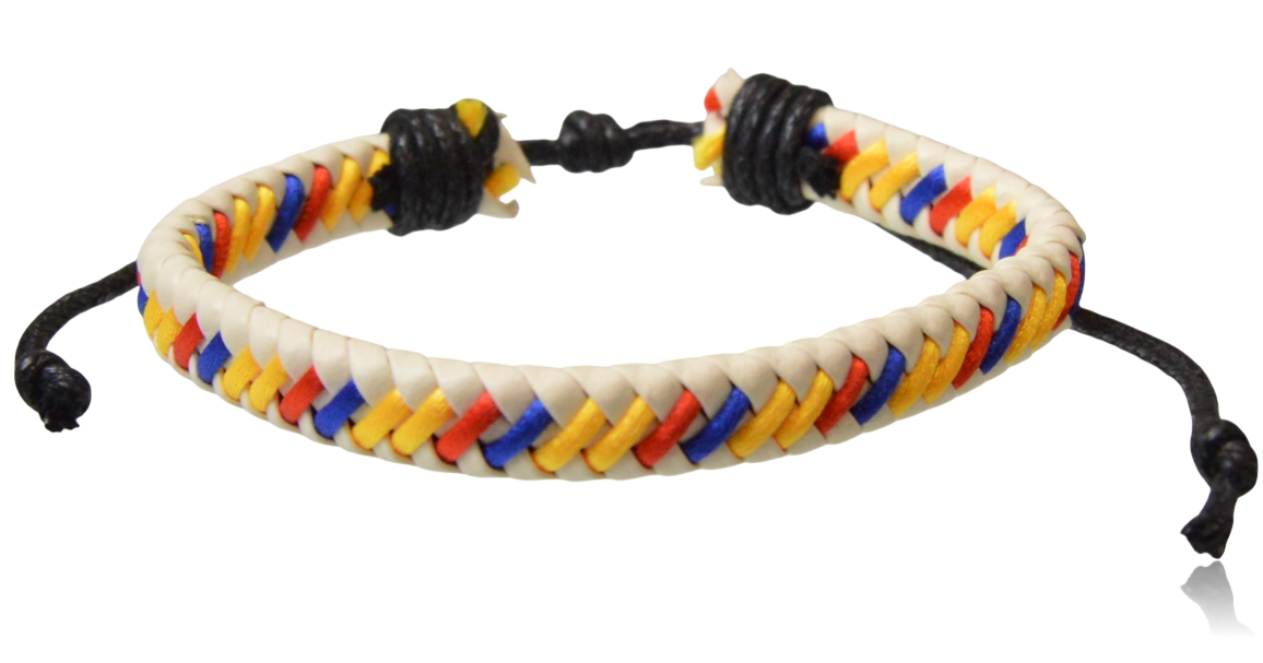 Casualowa bransoletka unisex wykonana z plecionej eko skóry, rzemienia i kontrastowego, żółtego, niebieskiego i czerwonego sznurka. Wyposażona w wygodną regulację obwodu za pomocą ściągacza.