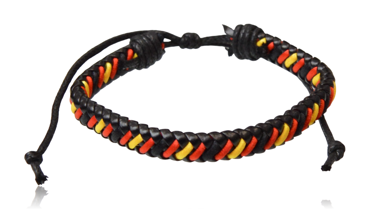 Casualowa bransoletka unisex wykonana z plecionej eko skóry, rzemienia i kontrastowego, żółto-czerwonego sznurka. Wyposażona w wygodną regulację obwodu za pomocą ściągacza.