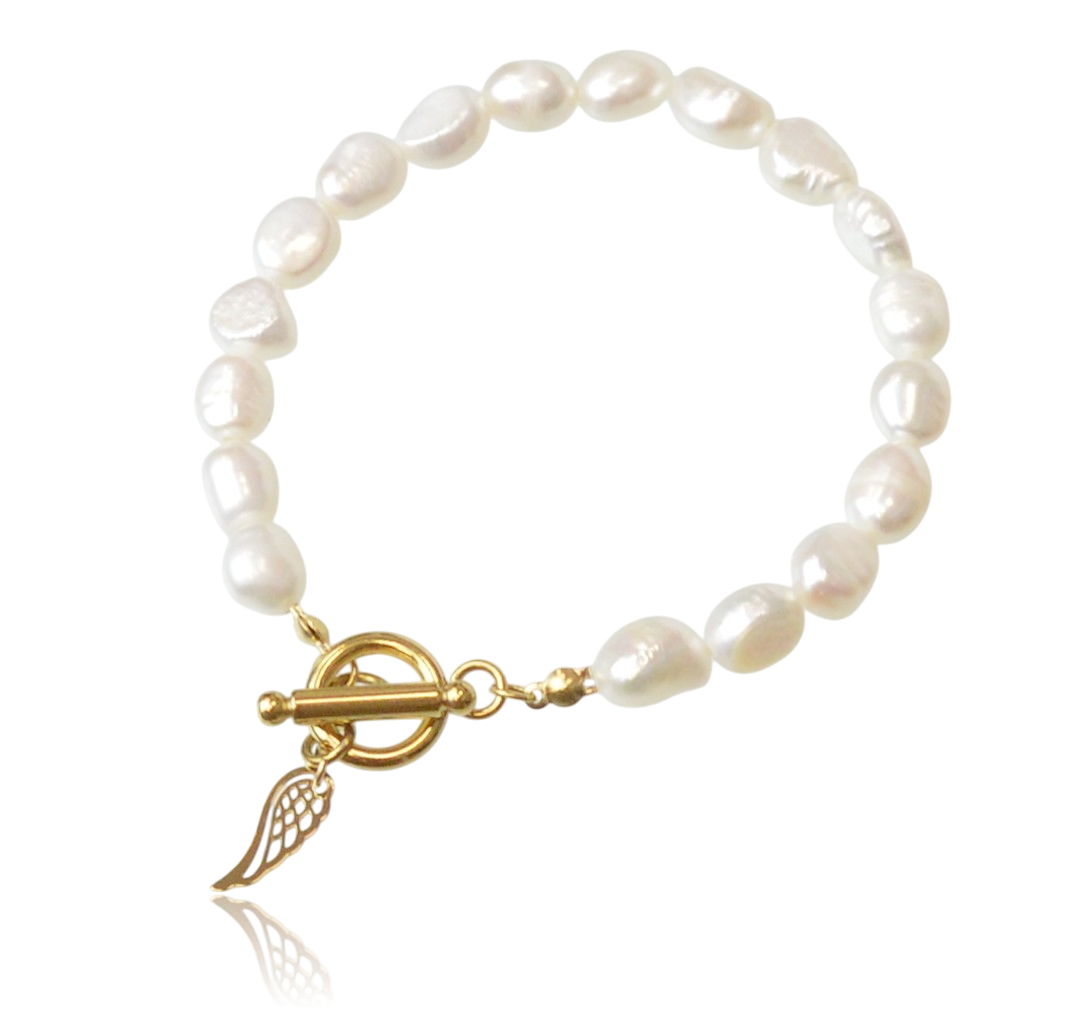 Bransoletka z pereł rzecznych, wykonana na złotej stali szlachetnej. Modne zapięcie toggle oraz urocza zawieszka w kształcie skrzydła czynią tę bransoletkę uniwersalnym i trwałym dodatkiem. Idealna dla miłośniczek biżuterii z pereł i nowoczesnych trendów.