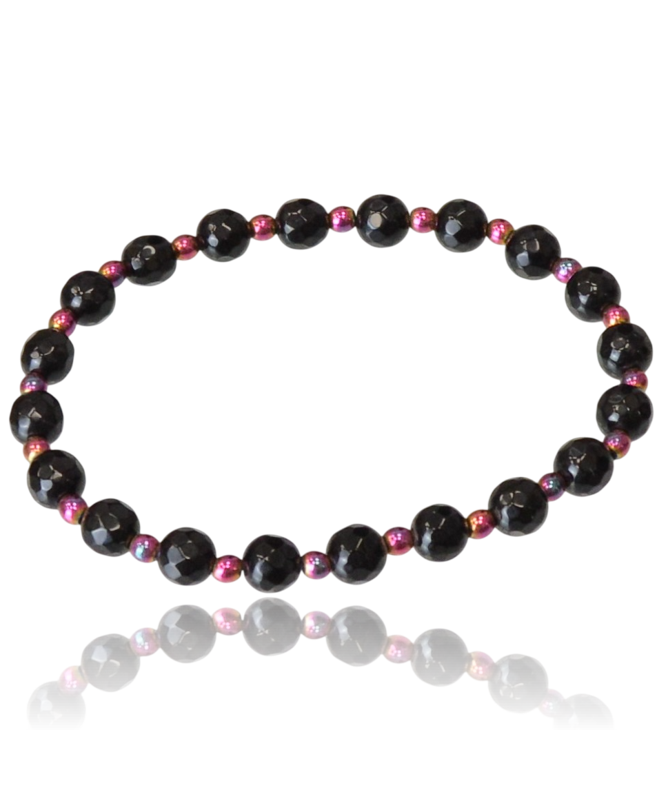 Zjawiskowa bransoletka wykonana z lśniącego, fasetowanego onyksu oraz drobnych koralików hematytu o benzynkowym wykończeniu. Połączenie głębokiej czerni z opalizującym fioletem i różem nadaje biżuterii magicznego, wieczorowego charakteru.
