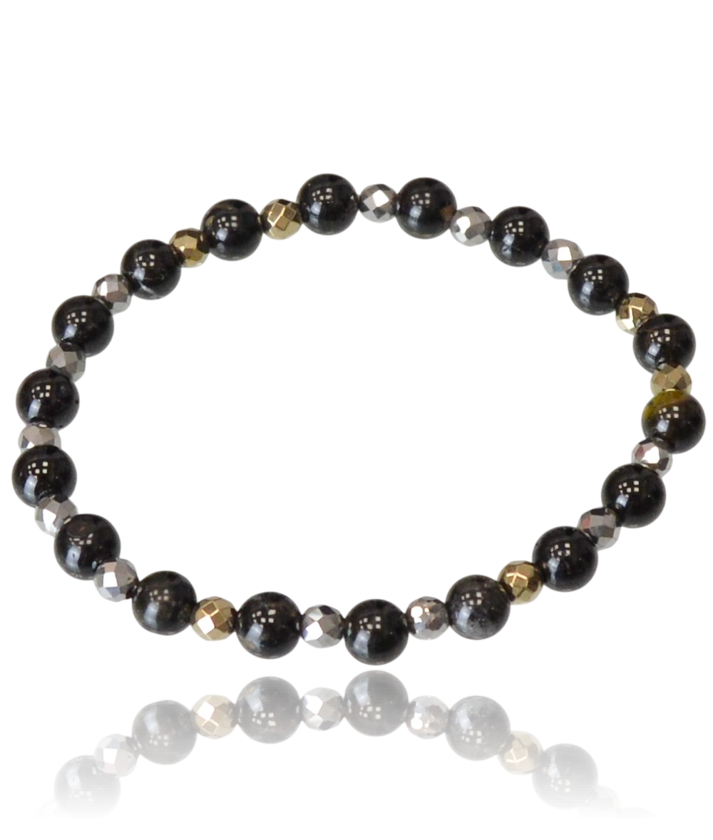 Wyjątkowa bransoletka wykonana z gładkich kulek czarnego onyksu, przeplatana fasetowanym hematytem w dwóch kontrastujących odcieniach: klasycznym złotym oraz stalowym szarym. To biżuteria o nowoczesnym designie, która łączy naturalną siłę kamieni z metalicznym blaskiem.