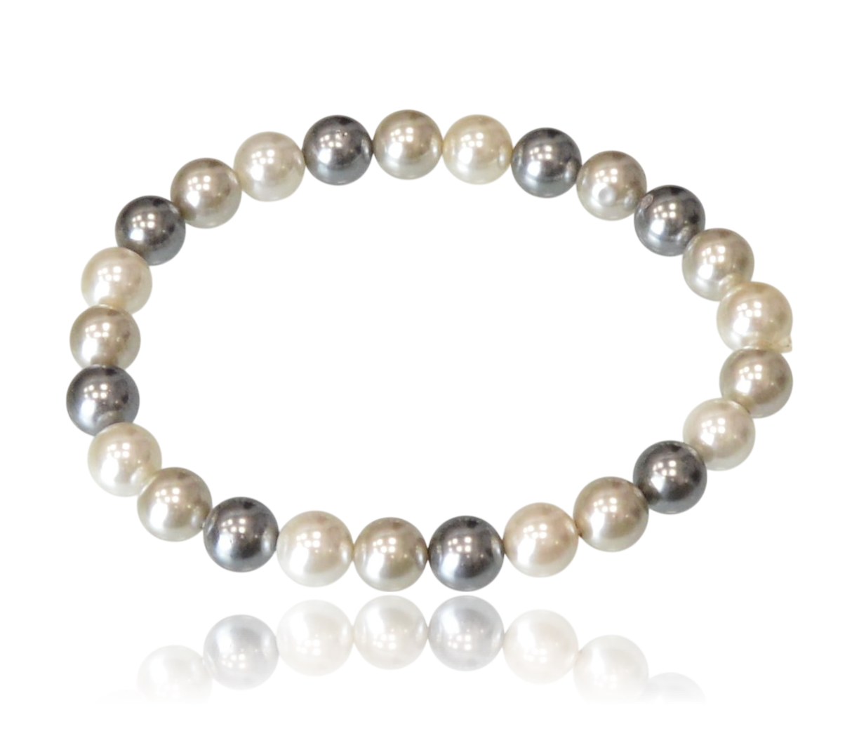 Stylowa bransoletka wykonana z pereł Majorka o średnicy 8 mm, prezentująca harmonijne połączenie trzech kolorów: klasycznej bieli, gołębiego szarego oraz głębokiego grafitu. To biżuteria, która łączy tradycyjny urok pereł z nowoczesną, stonowaną kolorystyką.
