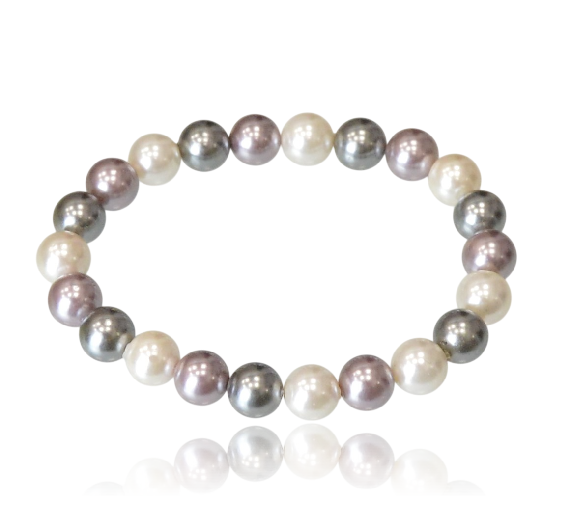 Subtelna bransoletka wykonana z pereł Majorka o średnicy 8 mm, łącząca klasyczną biel, nowoczesny grafit oraz delikatny, perłowy odcień lila. To elegancka kompozycja o chłodnej tonacji, która dodaje stylizacji romantycznego charakteru.