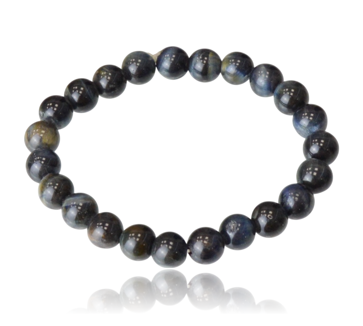 Dominujące odcienie ciemnego granatu płynnie przechodzą w przygaszoną zieleń oraz stalowe szarości, co nadaje bransoletce wielowymiarowości. Każdy koralik posiada unikalny układ pasm, dzięki czemu każdy egzemplarz jest niepowtarzalny. Bransoletka została nawleczona na wytrzymałą gumkę jubilerską, co zapewnia łatwość zakładania i idealne dopasowanie do nadgarstka. To uniwersalny dodatek, który doskonale uzupełni zarówno męskie, jak i damskie stylizacje, dodając im szczypty naturalnego luksusu.