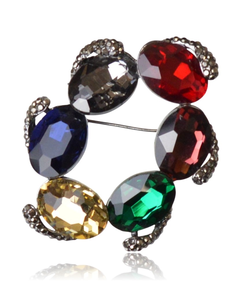 Luksusowa, owalna broszka wysadzana sześcioma dużymi, wielobarwnymi kryształami o głębokim szlifie. Dzięki dyskretnemu uchwytowi z tyłu, może być noszona jako efektowna zawieszka na łańcuszku lub tradycyjnie - jako broszka.