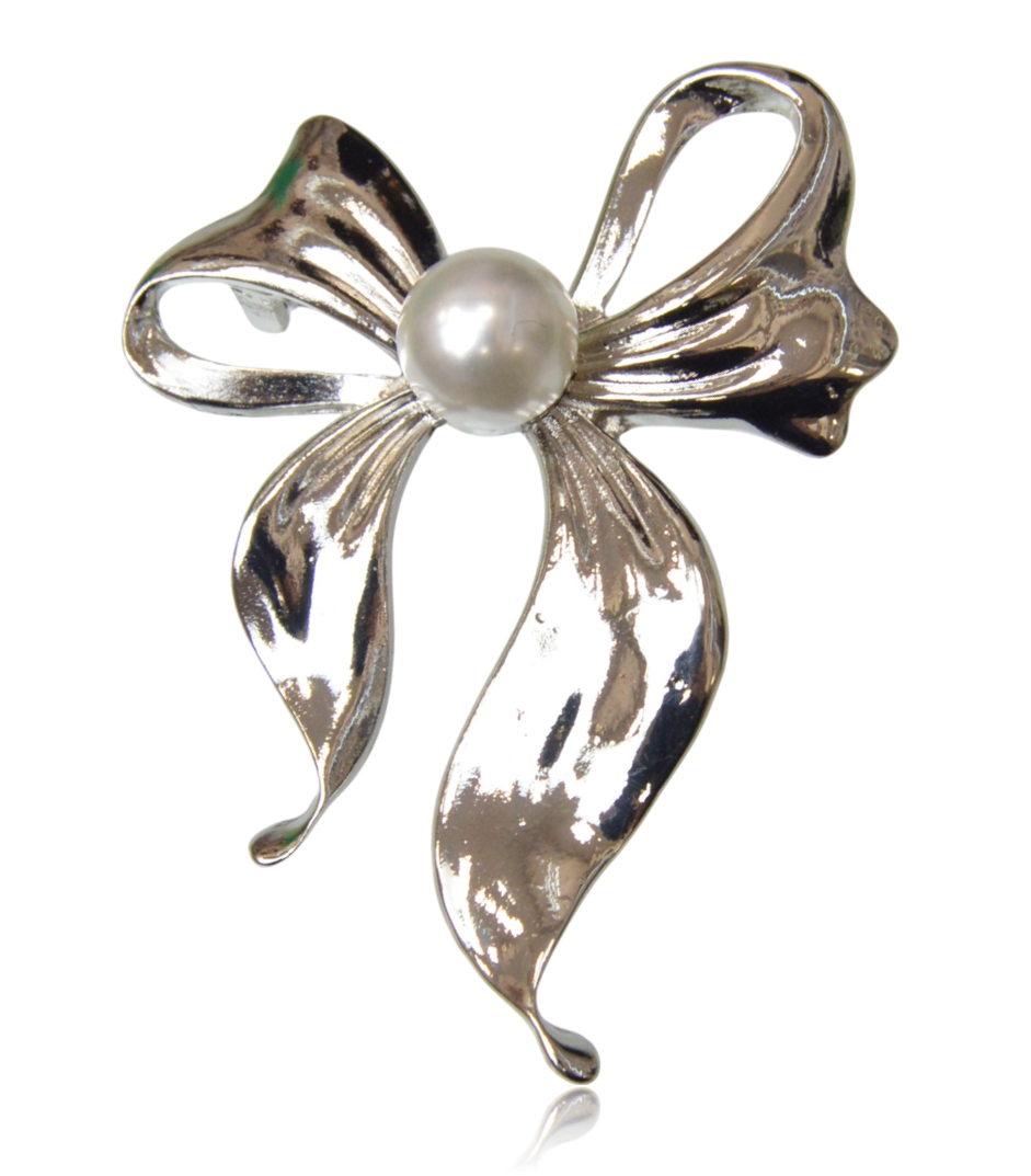 Wyrafinowana broszka kokarda o trójwymiarowej, rzeźbionej formie, imitującej fałdy jedwabnej wstążki. Centralnym elementem jest lśniąca imitacja perełki. Idealny, elegancki dodatek do żakietu, sukienki lub jako zapięcie szala w stylu vintage glamour.