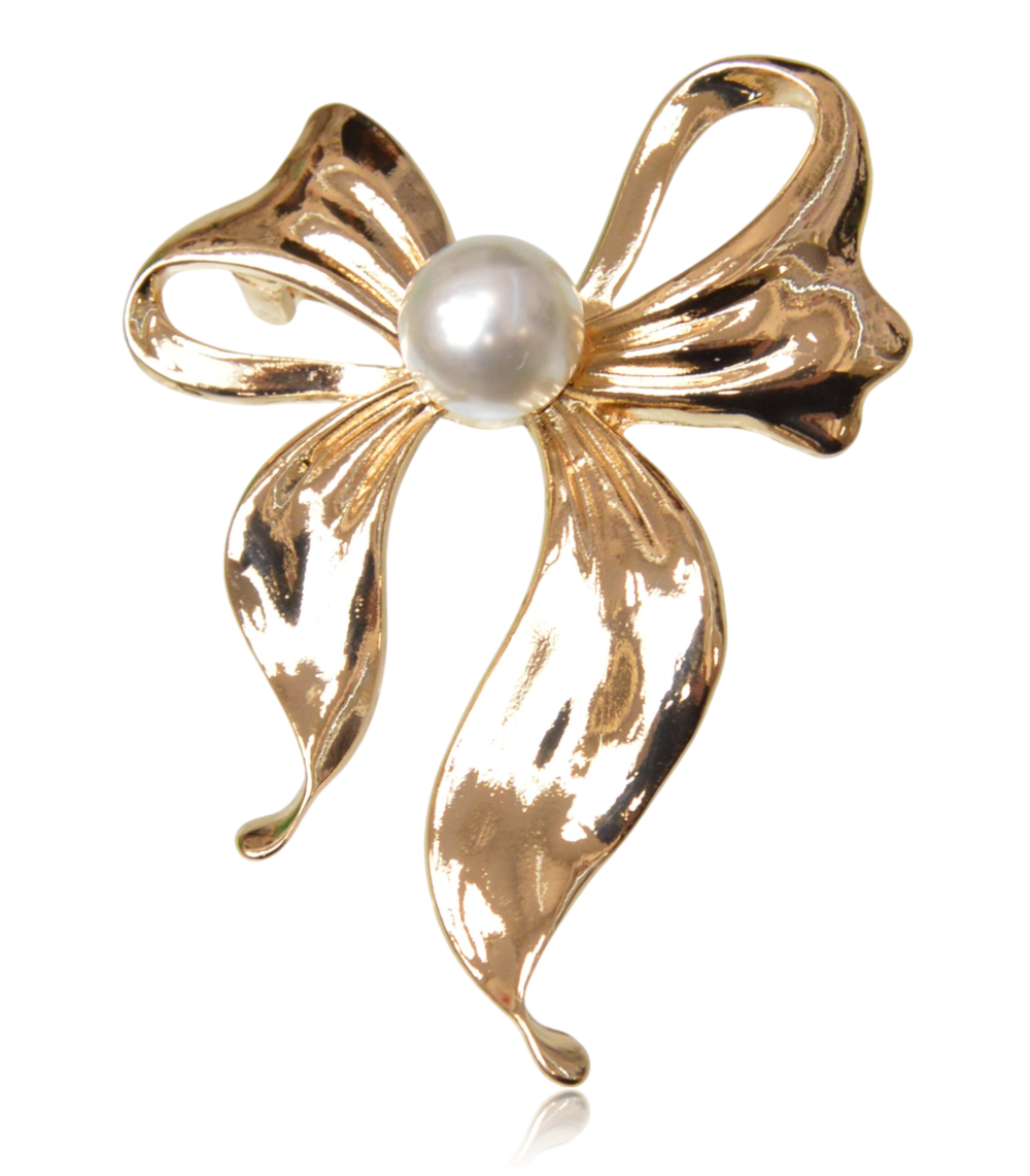 Wyrafinowana broszka kokarda o trójwymiarowej, rzeźbionej formie, imitującej fałdy jedwabnej wstążki. Centralnym elementem jest lśniąca imitacja perełki. Idealny, elegancki dodatek do żakietu, sukienki lub jako zapięcie szala w stylu vintage glamour.