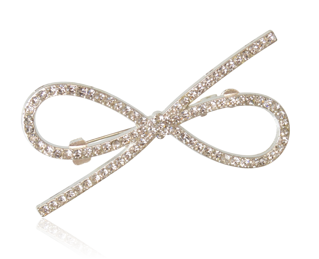 Delikatna broszka w kształcie kokardki, wysadzana błyszczącymi cyrkoniami – subtelny akcent o eleganckim charakterze.