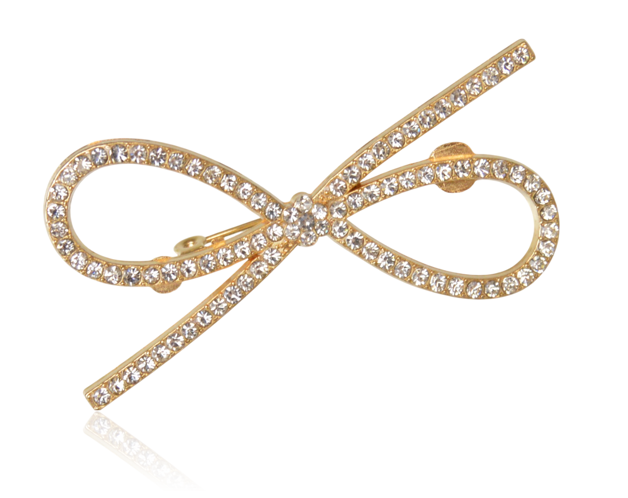 Delikatna broszka w kształcie kokardki, wysadzana błyszczącymi cyrkoniami – subtelny akcent o eleganckim charakterze.