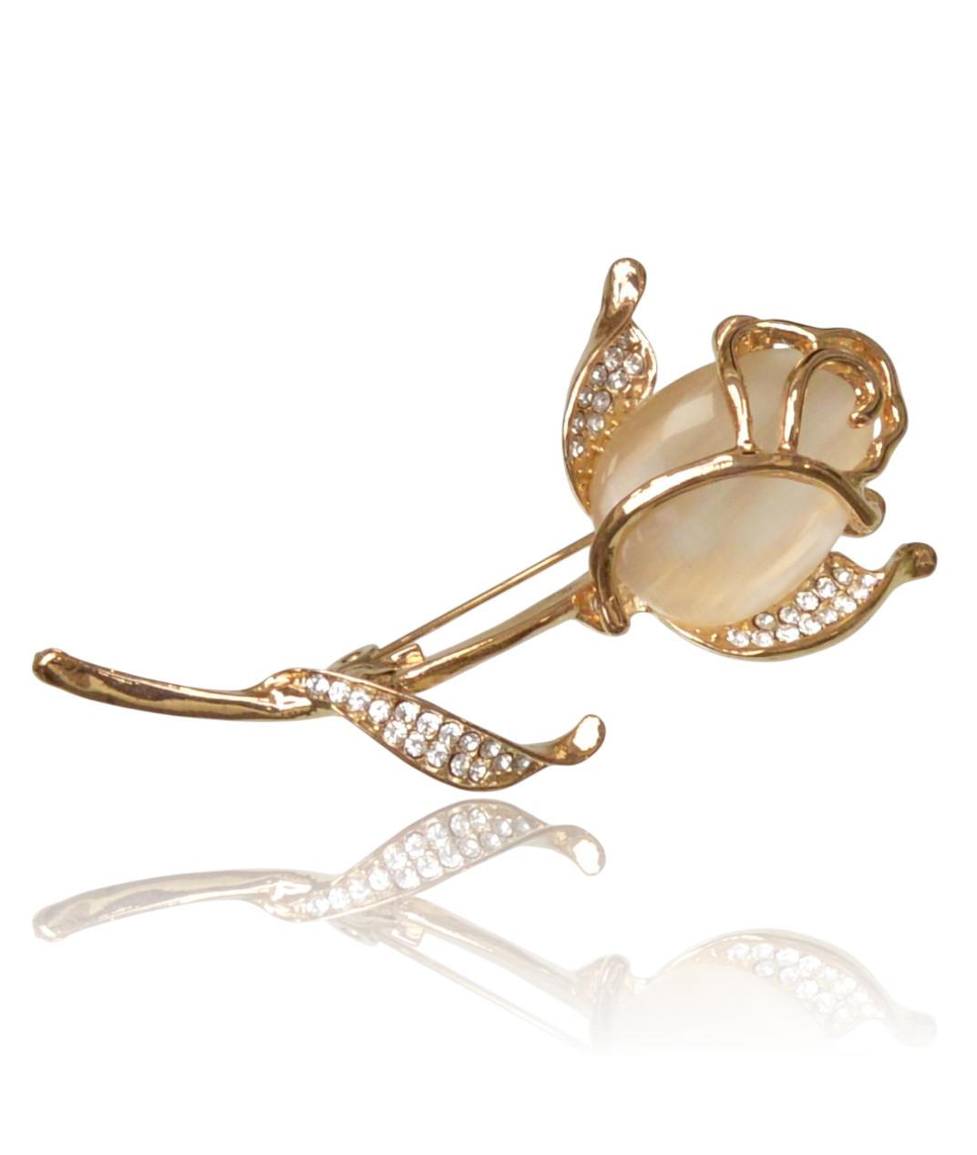 Ta zachwycająca broszka to połączenie natury i biżuteryjnego kunsztu. Płatki kwiatu zostały wypełnione masą żywiczną o perłowym wykończeniu, która pięknie opalizuje, nadając całości szlachetnego wyglądu. Serce kwiatu oraz listek zdobią liczne, drobne cyrkonie, które wspaniale odbijają światło przy każdym ruchu.