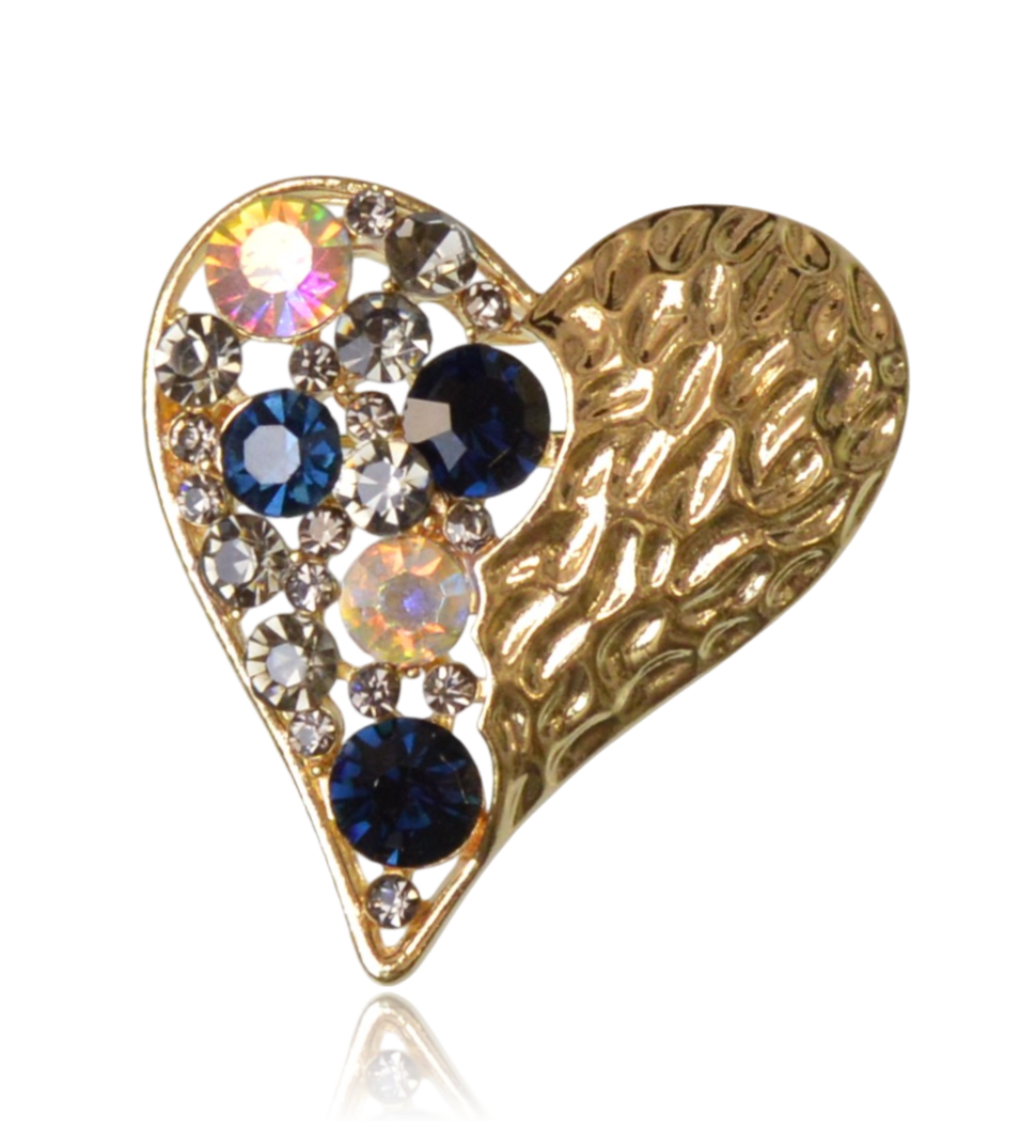 Zjawiskowa broszka w kształcie serca, łącząca blask wielokolorowych kryształków z elegancką, młotkowaną strukturą złota. Wyjątkowy dodatek, który nada wyrazistego charakteru każdej marynarce, płaszczowi czy szalowi.