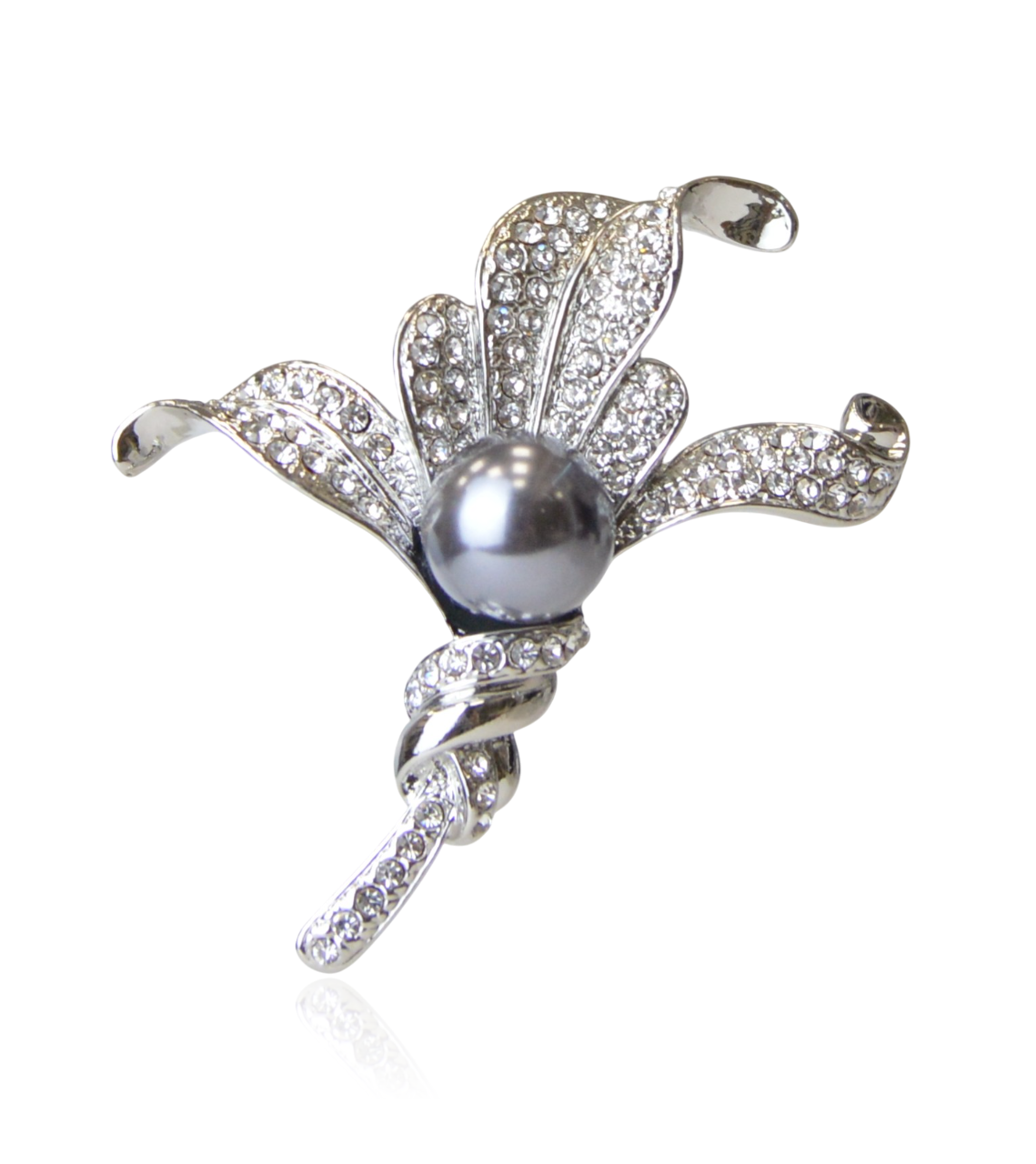 Broszka srebrny liść z cyrkoniami i szarą perłą