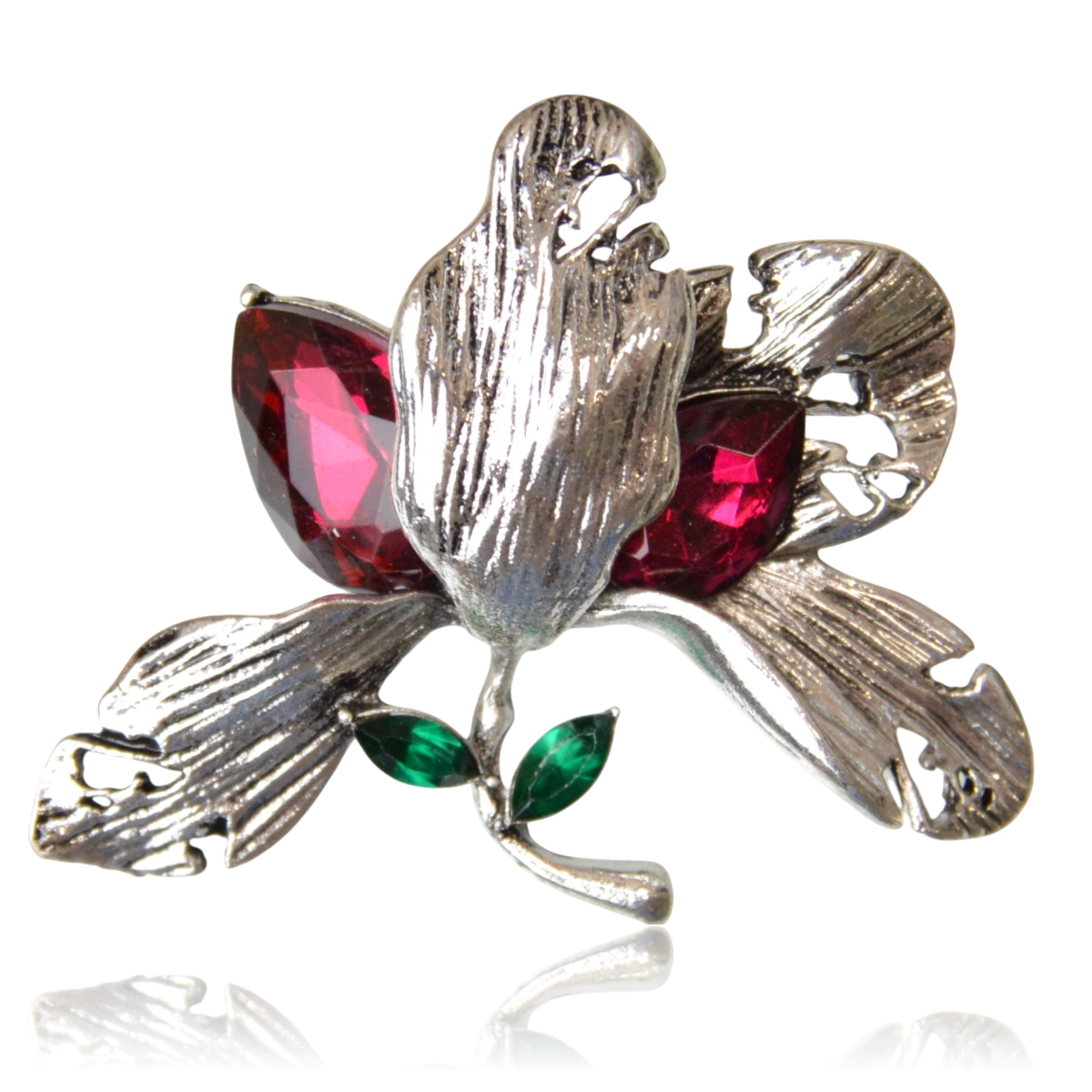 Broszka w formie kwiatów i liści utrzymana w srebrnej tonacji przywodzi na myśl klasyczną biżuterię z dawnych lat. Połyskujące malinowe i zielone kamienie podkreślają jej szykowny, retro charakter. Idealna dla miłośniczek ponadczasowych dodatków.