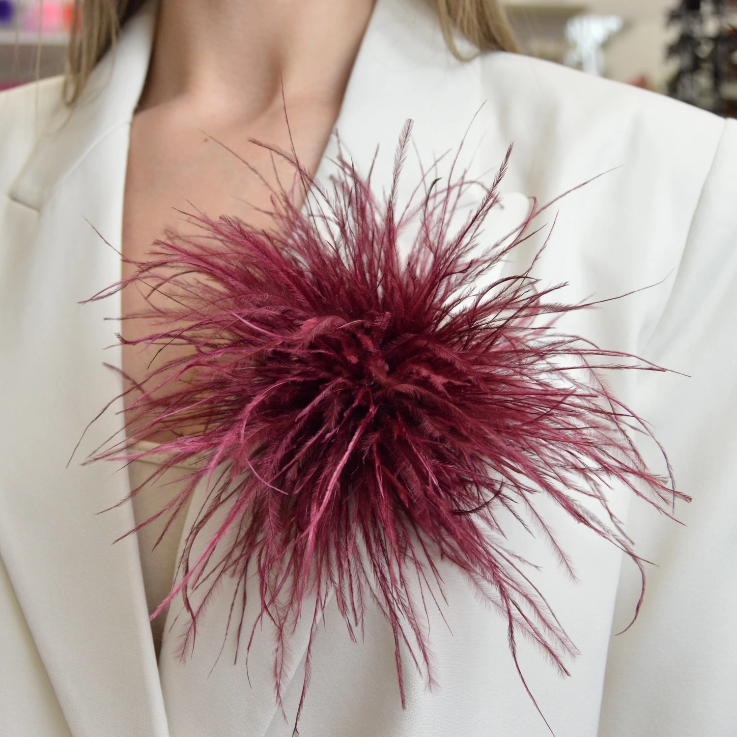 Dodaj swojej stylizacji objętości i modowego sznytu dzięki broszce z piór marabuta. Ta puszysta ozdoba w głębokim, eleganckim kolorze burgundu to must-have dla miłośniczek stylu glamour i nowoczesnej elegancji. Pióra są niezwykle lekkie i miękkie, dzięki czemu efektownie poruszają się przy każdym ruchu.