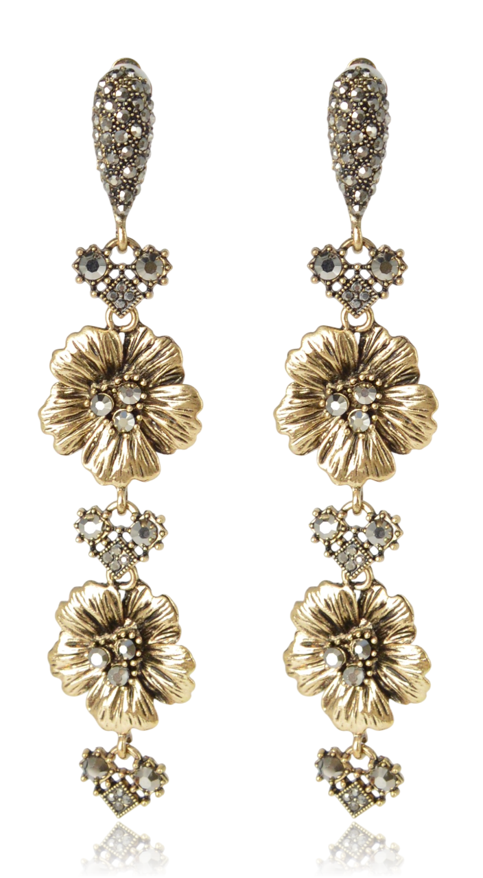 Luksusowe, bardzo długie klipsy w stylu vintage glamour. Kaskada ażurowych kwiatów w kolorze starego złota ozdobiona szarymi cyrkoniami. Mimo długości 10,3 cm, są zaskakująco lekkie. Idealne, by dodać strojowi wytworności i teatralnego szyku.