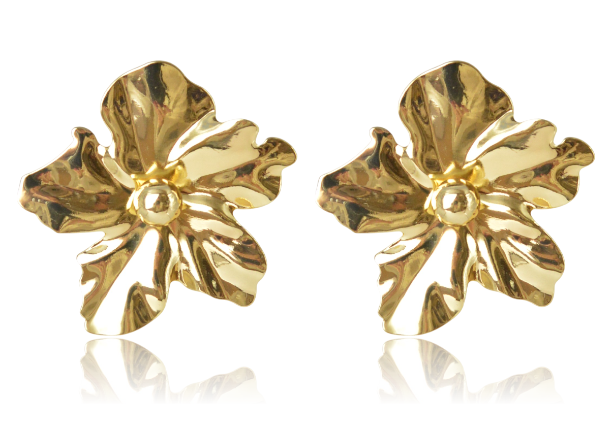 Duże, wyraziste klipsy w kształcie kwiatów (śr. 4,5 cm). Wykonane z metalu nieszlachetnego w złotym kolorze. Mimo rozmiaru, są bardzo lekkie i wygodne. Idealne, by dodać stylizacji odrobiny wytworności i elegancji glamour.