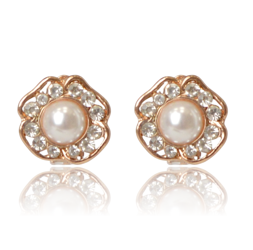Urocze i niezwykle kobiece klipsy w kształcie kwiatuszków, wykonane z metalu nieszlachetnego w kolorze różowego złota (rosegold). Kompozycja łączy satynowy blask białej imitacji perły z lśniącym wianuszkiem drobnych cyrkonii.