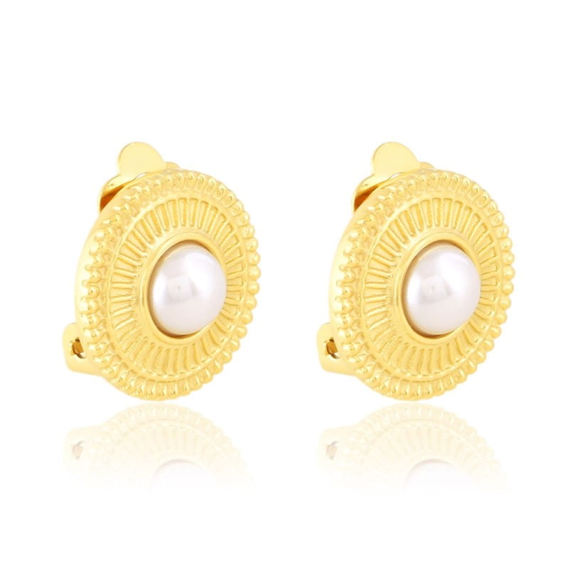 Odkryj elegancję i ponadczasowy urok z naszymi klipsami ze stali w kolorze złotym, ozdobionymi imitacją pereł. Perły zostały osadzone na teksturowanej, okrągłej blaszce, tworząc subtelną, ale wyrazistą ozdobę. Te klipsy to doskonałe rozwiązanie dla osób, które nie mają przekłutych uszu, a chcą dodać swojej stylizacji wyjątkowego charakteru. Ich klasyczny design sprawia, że idealnie pasują na każdą okazję, a także stanowią elegancki pomysł na prezent dla bliskiej osoby. Wybierz elegancję i komfort w jednym!