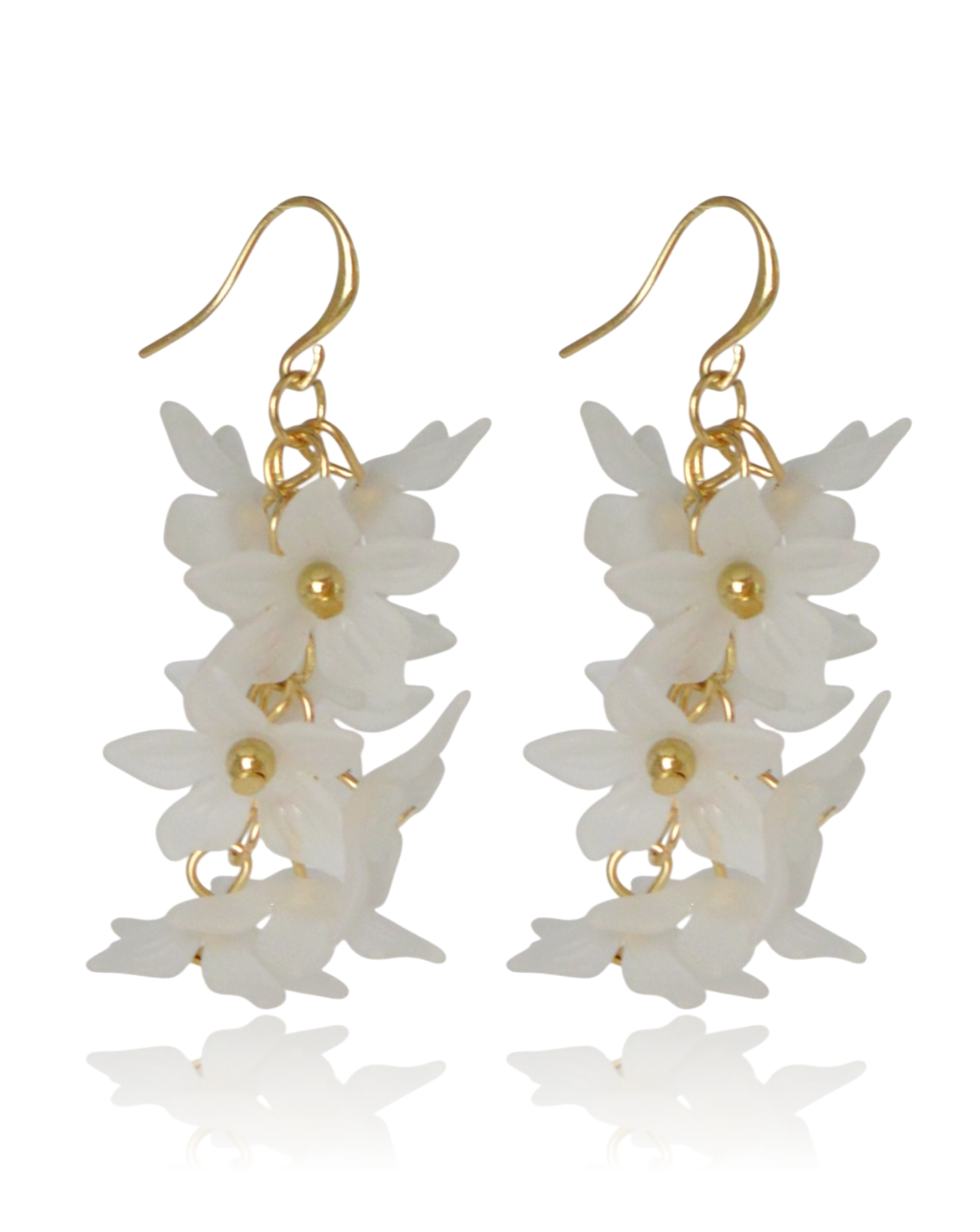 Subtelne kolczyki wiszące ozdobione kaskadą białych, akrylowych kwiatów ze złotymi środkami. Lekki i romantyczny dodatek, który doda blasku każdej kobiecej stylizacji.
