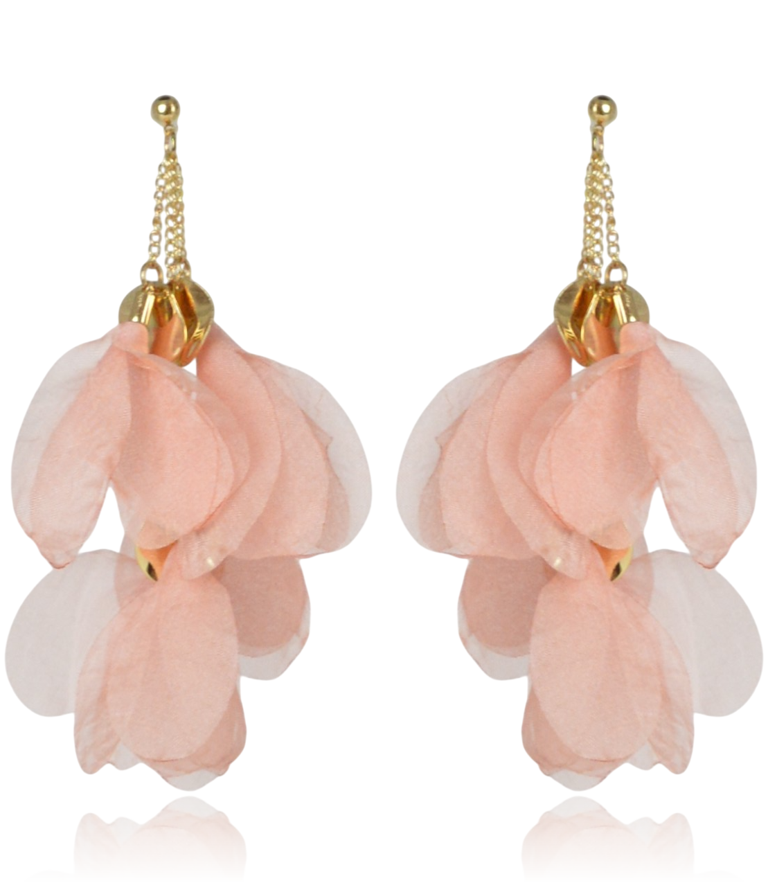 Zjawiskowe, ultra lekkie kolczyki o długości 12 cm w odcieniu łososiowym. Połączenie poczwórnego złotego łańcuszka, pogiętych blaszek odbijających światło i delikatnej tkaniny tworzy efektowny dodatek w stylu romantycznego boho.