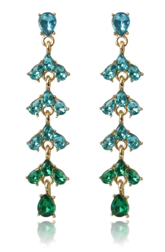 Górną część zdobią kryształy w jasnym odcieniu turkusu, które schodkowo przechodzą w głęboką, szmaragdową zieleń u dołu. Większość segmentów ma formę potrójnych listków wykonanych z kamieni o szlifie łezki, co nadaje całości organicznego, roślinnego charakteru. Kolczyki są osadzone na klasycznych sztyftach, a ich wydłużona linia pięknie wysmukla szyję, czyniąc je idealnym dodatkiem do wieczorowych kreacji oraz eleganckich letnich stylizacji.
