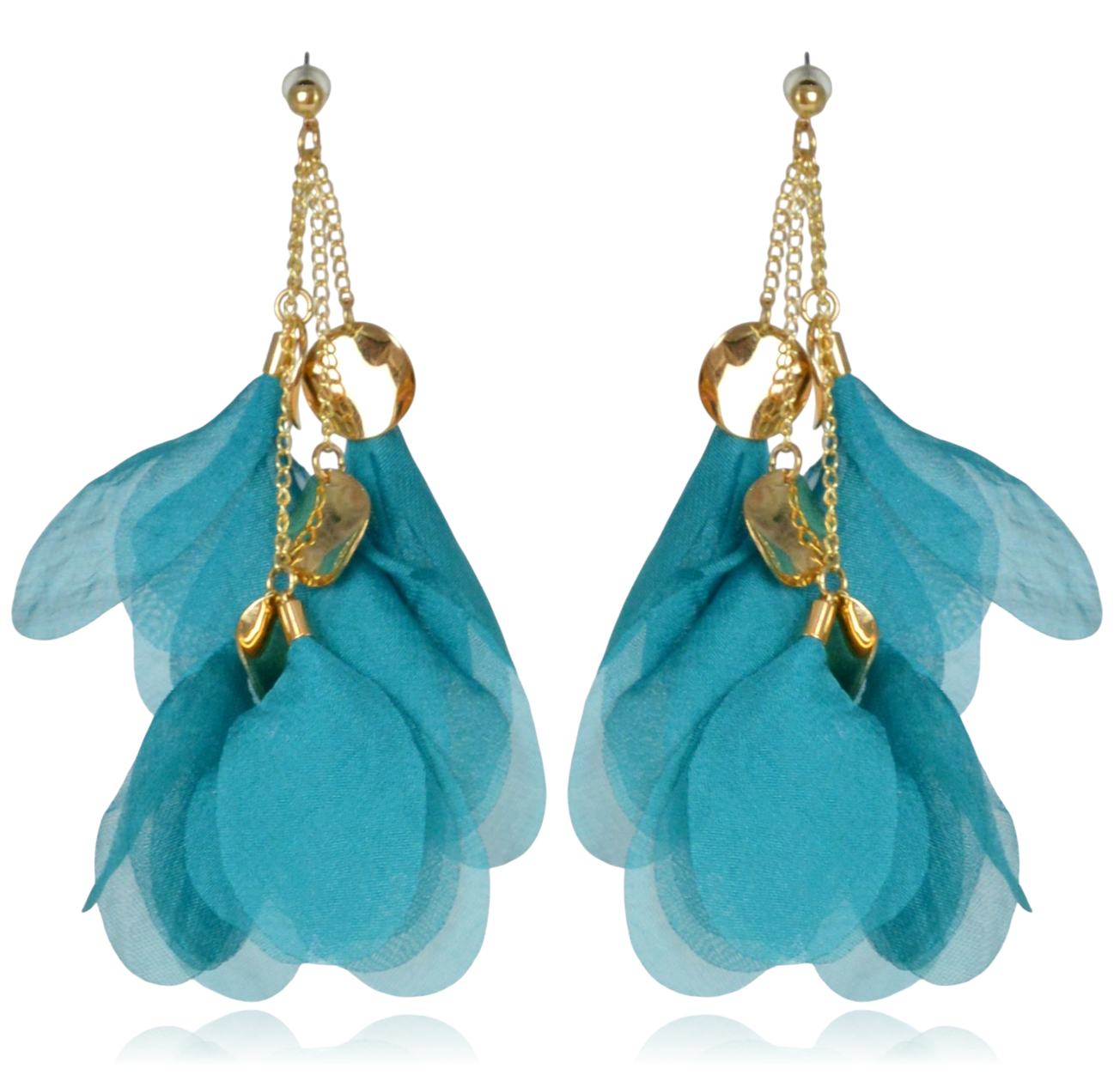 Głównym akcentem są pogięte, złote blaszki, które dzięki nieregularnej strukturze efektownie odbijają światło przy każdym ruchu. Całość dopełniają kaskady płatków z lekkiej tkaniny w intensywnym kolorze turkusowym, które nadają biżuterii egzotycznego charakteru. Kolczyki te stanowią idealny wybór dla kobiet kochających dodatki typu "statement", które optycznie wysmuklają szyję i dodają blasku twarzy.