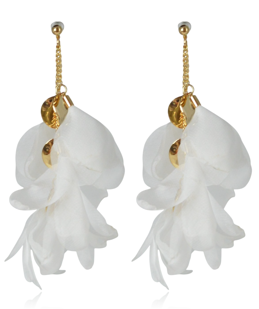 Efektowne, wiszące kolczyki wykonane z wielu warstw zwiewnego, białego materiału, który tworzy formę bogatych kwiatostanów. Złote łańcuszki i połyskujące elementy dodają im luksusowego wykończenia, idealnego na wielkie wyjścia.