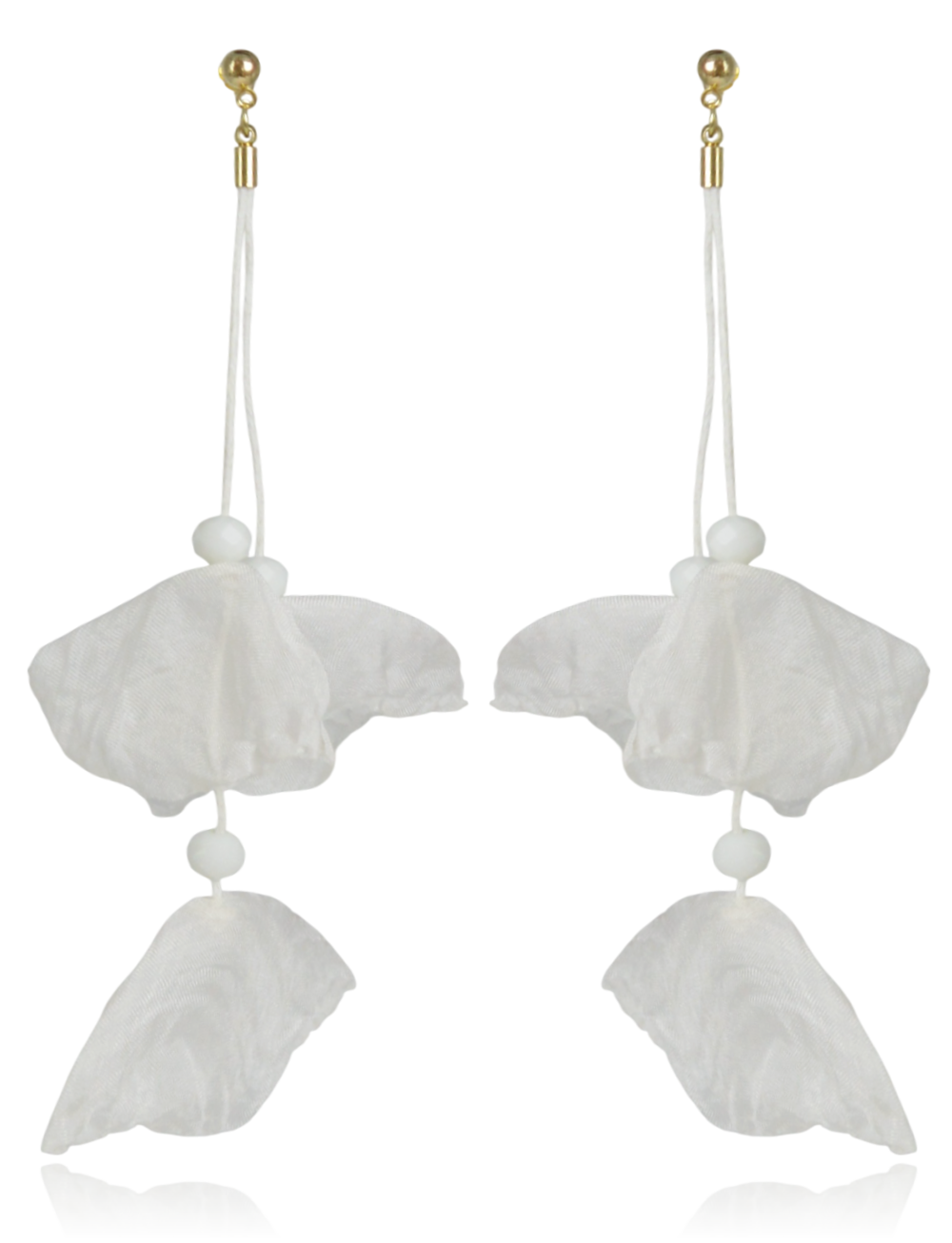 Długie, wiszące kolczyki wykonane z delikatnego, białego materiału przypominającego płatki kwiatów. Zwieńczone złotymi sztyftami i subtelnymi koralikami, stanowią idealny dodatek dla kobiet ceniących lekkość i romantyczny design.