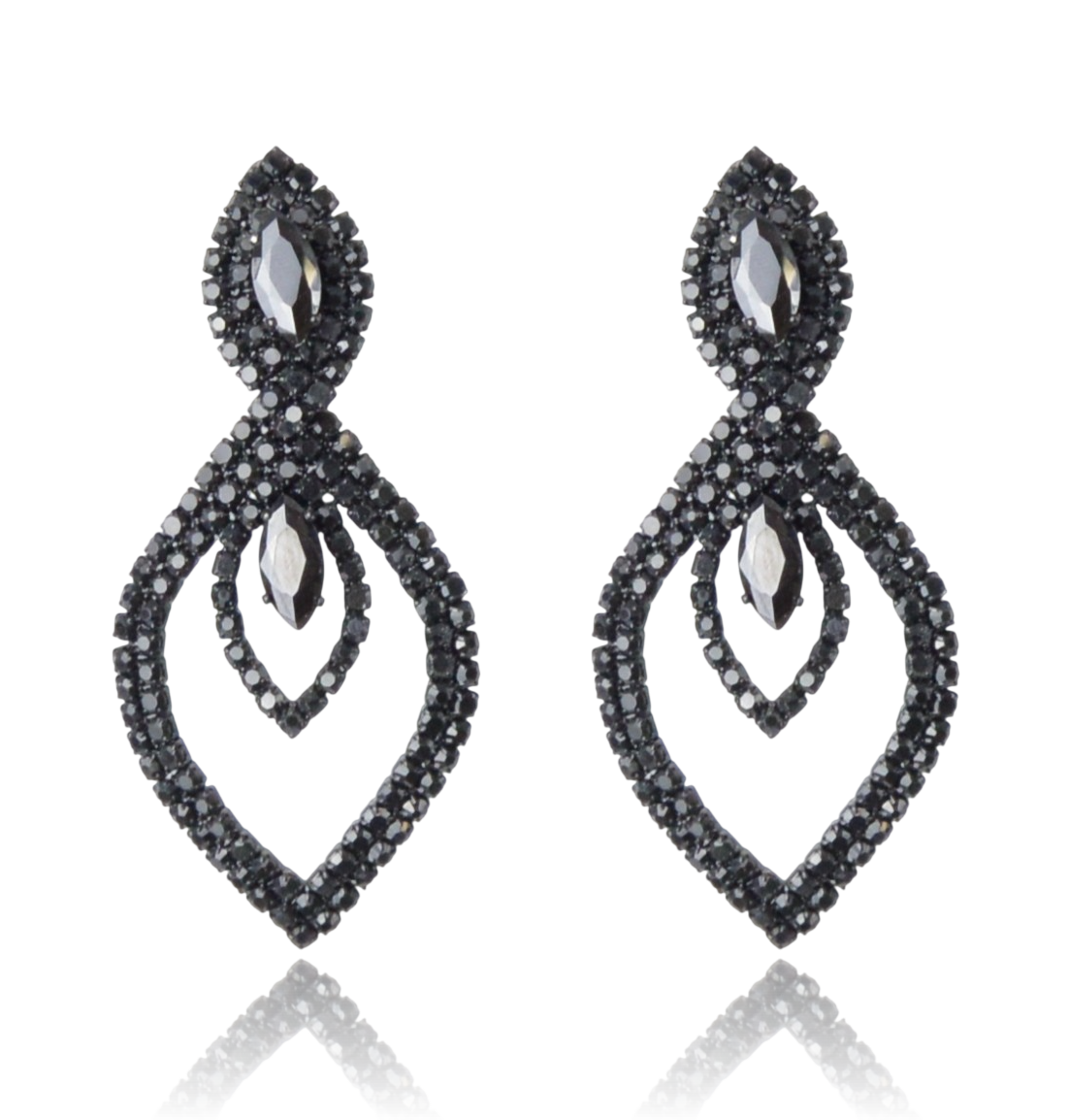 Zjawiskowe, wiszące kolczyki w kształcie łezek, wykonane z metalu nieszlachetnego w kolorze głębokiej czerni. Kunsztowna, ażurowa forma została bogato wysadzona czarnymi cyrkoniami, tworząc efekt wieczorowej elegancji.