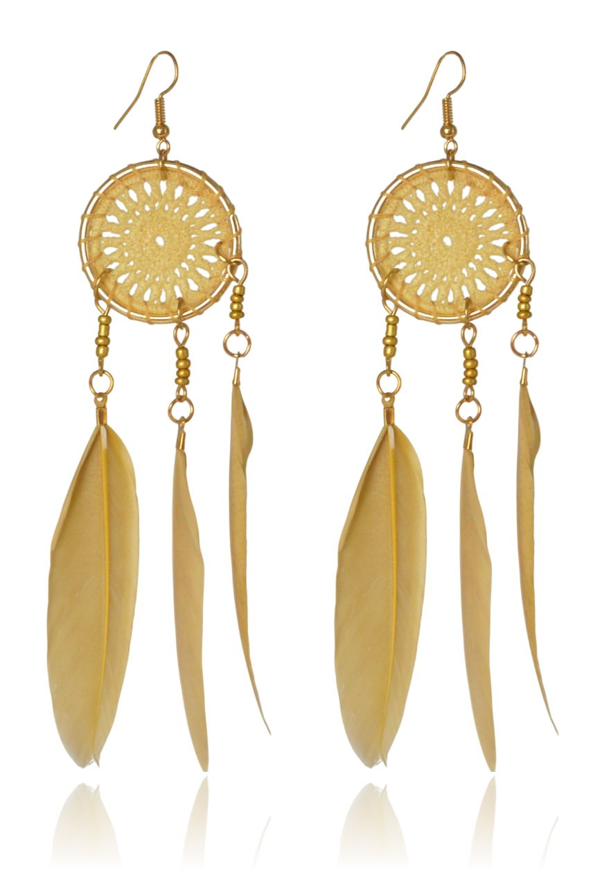 Odkryj magię stylu etno z kolczykami, które przyciągają spojrzenia. Model ten łączy w sobie kunsztowne, plecione rozety przypominające łapacze snów oraz kaskadę miękkich, naturalnych piór w najmodniejszym kolorze sezonu – musztardowym.