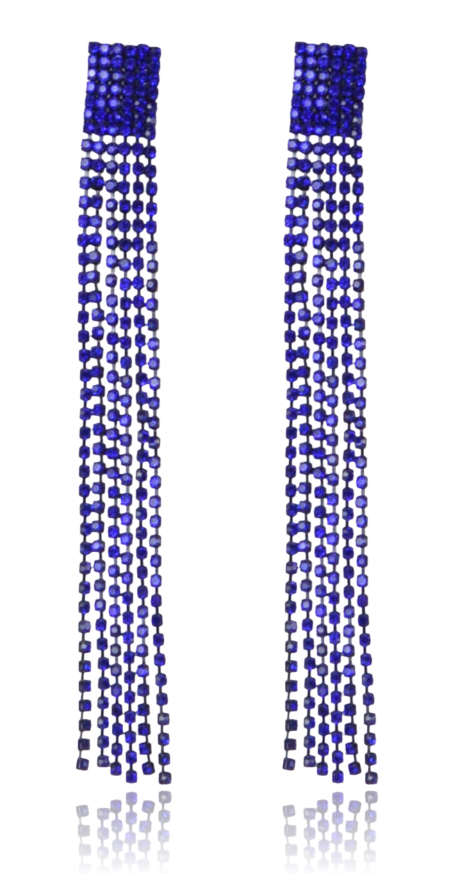 Zjawiskowe, długie kolczyki typu chwosty, wykonane z metalu w kolorze głębokiego, ciemnego granatu. Całość składa się z gęstych rzędów drobnych kryształków, które tworzą efekt mieniącej się kaskady.