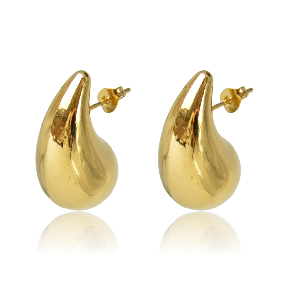 Ultranowoczesne kolczyki sztyfty ze stali nierdzewnej w lśniącym złotym kolorze. Posiadają modny, wypukły i gładki kształt kropli (puffy), który jest hitem sezonu. To biżuteria o silnym, rzeźbiarskim charakterze, która natychmiastowo nadaje stylizacji luksusowy wygląd.
