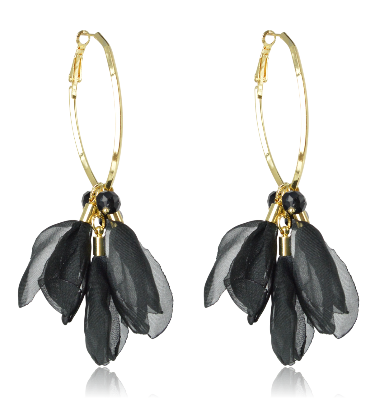 Zawieszone są na eleganckim, złotym biglu (zapięcie typu angielskiego), wykonanym z metalu nieszlachetnego, które zapewnia komfort noszenia. Główną ozdobę stanowią swobodnie wiszące elementy z czarnej, półprzezroczystej tkaniny, ułożone w kształt płatków. Akcentem glamour są drobne, fasetowane kryształki, które błyszczą przy najmniejszym ruchu. Kolczyki te są niezwykle lekkie, idealne na większe imprezy lub jako romantyczny dodatek do sukienek.