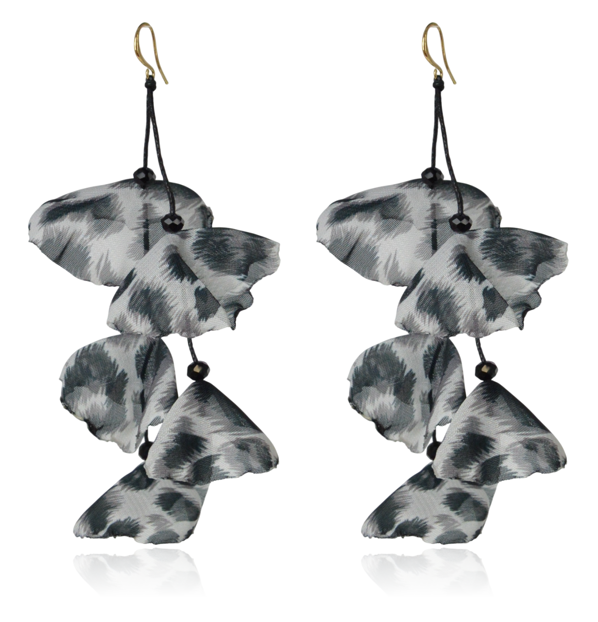 Efektowne, długie kolczyki, które łączą materiałowy element w modny wzór panterki z błyszczącymi fasetowanymi kryształkami. Ich elegancka forma i dynamiczny design przyciągają spojrzenia, dodając stylizacjom wyrazistego charakteru.