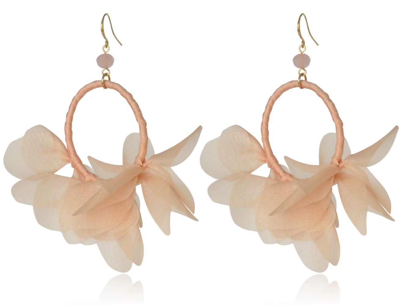 Główną ozdobą są zwiewne elementy z tkaniny w odcieniu łososiowym, które przypominają płatki kwiatów poruszane wiatrem. Całość rozświetlają fasetowane kryształki, które pięknie załamują światło przy każdym Twoim ruchu. Dzięki swojej wyjątkowej lekkości, kolczyki są niemal niewyczuwalne na uchu, co czyni je idealnym wyborem na romantyczne spacery, letnie przyjęcia czy codzienne stylizacje, którym chcesz dodać kobiecego uroku.