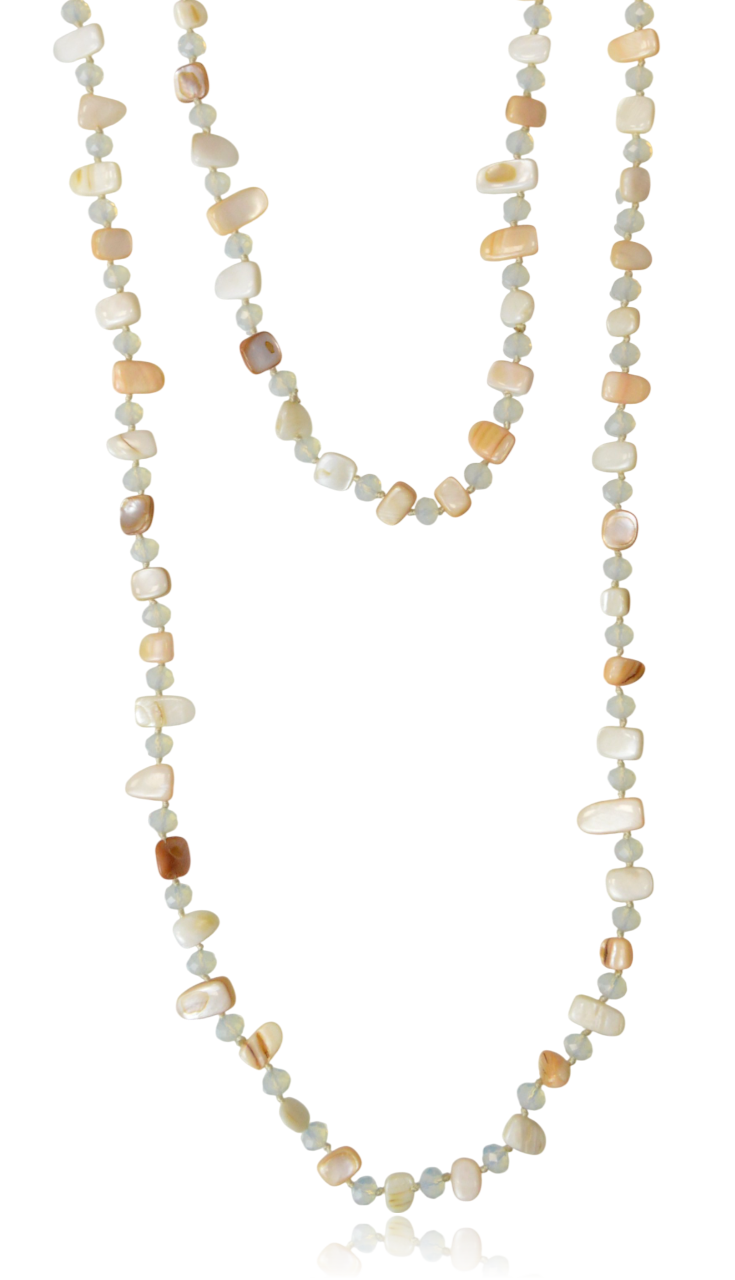 Eleganckie, długie korale o obwodzie 120 cm idealne do noszenia pojedynczo lub podwójnie. Wykonane z błyszczących, nieregularnych kawałków masy perłowej w odcieniu kremowo-beżowym oraz przeplatane fasetowanymi, szklanymi koralikami w kolorze opalu. Połączenie tych materiałów i barw tworzy wyrazisty, ale jednocześnie subtelny akcent. Korale są lekkie i doskonale pasują do swetrów, tunik oraz kreacji wieczorowych, dodając im szyku i blasku. Długi sznur pozwala na różnorodne stylizacje.