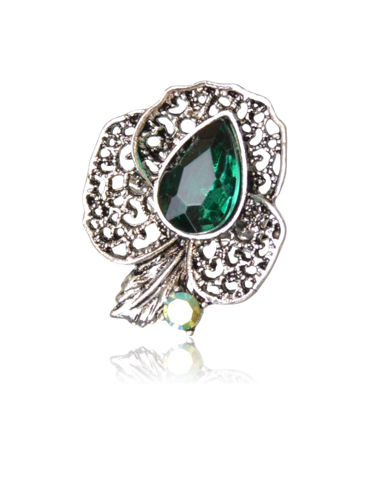 Nieduża, lecz efektowna broszka w stylu retro. W centrum znajduje się czerwony kryształ w kształcie kropli, oprawiony w ażurową ramę w formie delikatnego listka z mieniącym się kamieniem. Całość przyciąga uwagę subtelnym blaskiem i klasycznym wykończeniem.