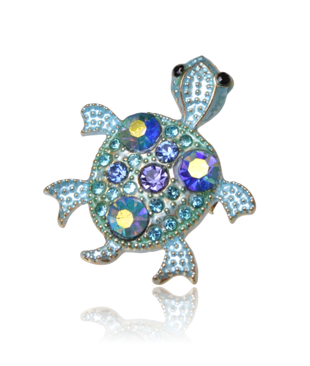 Urocza mini broszka żółwik (3 cm), wykonana z dbałością o każdy detal. Model zdobiony lśniącymi cyrkoniami oraz kolorową emalią, osadzony na metalu o ciekawej, "kropkowanej" strukturze.