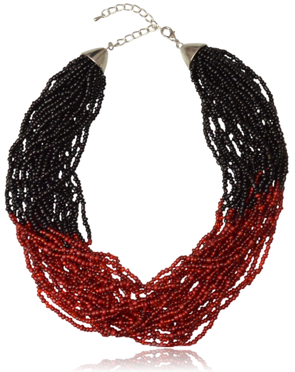 Spektakularny naszyjnik wykonany z niezliczonej ilości drobnych koralików sieczki. Projekt typu ombre/gradient łączy głęboką czernią u góry z intensywnym bordo na dole. Ten wielosznurkowy naszyjnik tworzy efektowny biżuteryjny akcent. Posiada regulowane zapięcie – idealny, wyrazisty dodatek do stylizacji etno, boho lub wieczorowych.