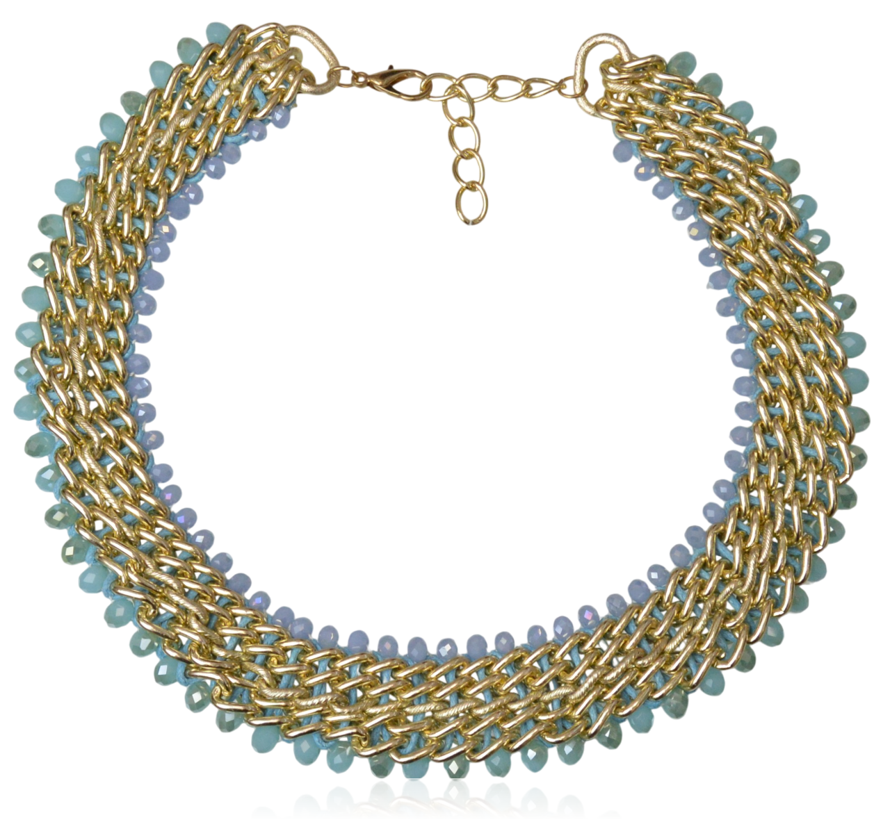 Naszyjnik kolia w formie kilkurzędowego łańcucha to elegancka i subtelna propozycja, która doda blasku każdej stylizacji. Złoty kolor łańcucha w połączeniu z delikatnymi, fasetowanymi kryształkami w odcieniach jasnoniebieskich tworzy harmonijną całość, pełną lekkości i szyku. Kryształki odbijają światło, tworząc efekt subtelnego migotania, który przyciąga wzrok. Ten naszyjnik jest idealnym wyborem na eleganckie wyjścia, specjalne okazje lub po prostu na co dzień, by dodać odrobiny blasku i świeżości do każdej stylizacji.