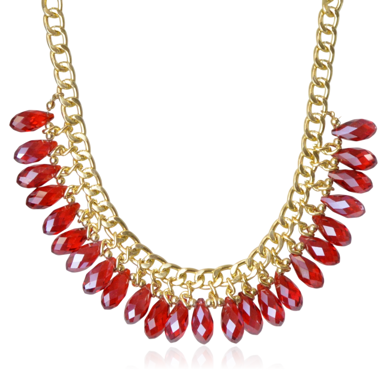 Naszyjnik – kolia z masywnego, złotego łańcucha, zdobiona fasetowanymi kryształkami w formie czerwonych, opalizujących łezek. Jego efektowny, dynamiczny wygląd przypomina pióropusz, przyciągając wzrok i nadając każdej stylizacji odważny, luksusowy charakter. Idealny wybór na wieczorne wyjścia, bankiety i inne wyjątkowe okazje, gdzie chcesz zabłysnąć.