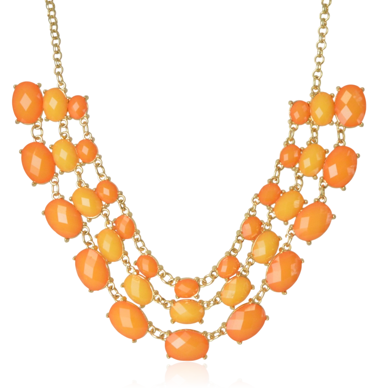 Naszyjnik – kolia na złotym łańcuszku z tradycyjnych ogniwek, ozdobiona owalnymi, szlifowanymi elementami w odcieniach pomarańczowego. Rozłożone w trzech rzędach, tworzą elegancki i subtelny wzór, który przyciąga wzrok. Doskonały wybór na wieczorne wyjścia, wesela czy inne wyjątkowe okazje, nadając stylizacji ciepły, złocisty blask.