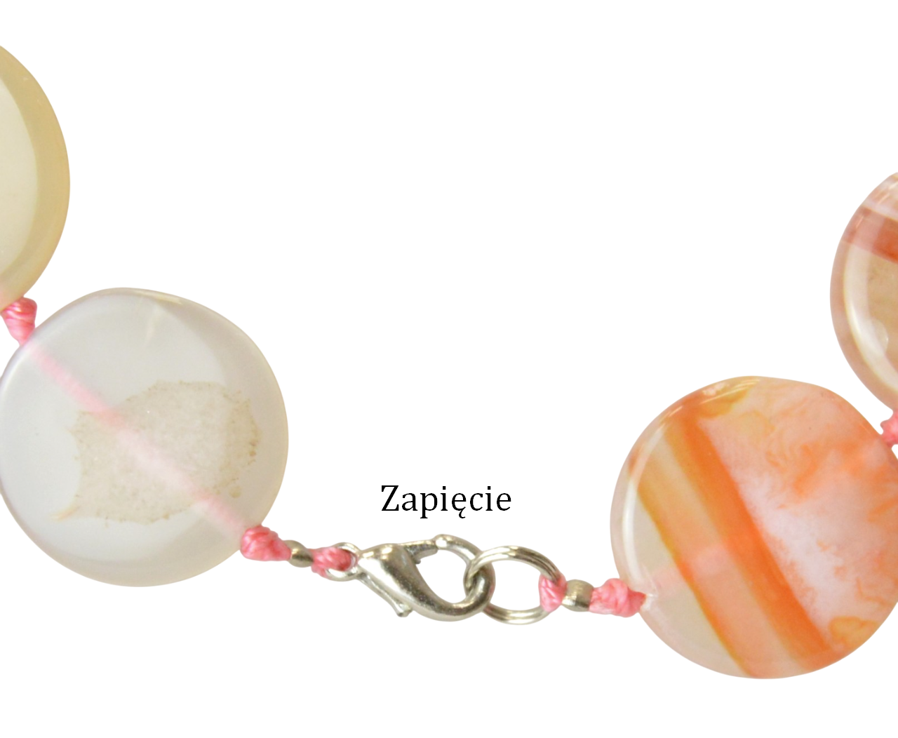 Materiał: kamień syntetyczny agat karneolowy, nić jubilerska, metal nieszlachetny