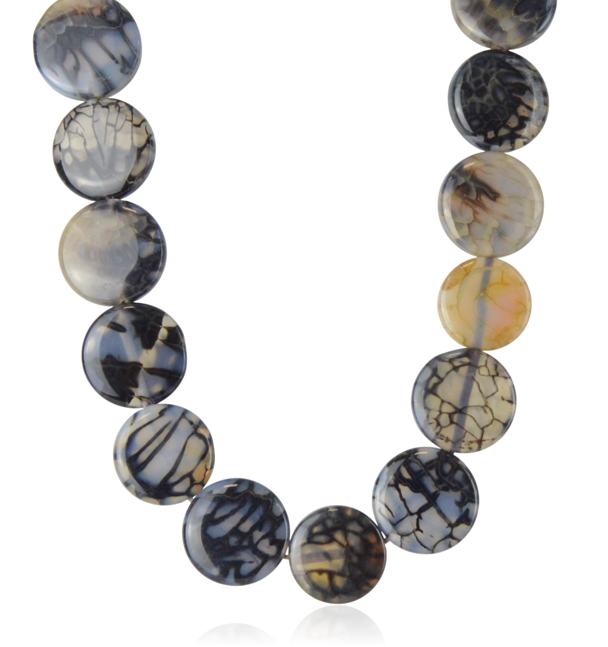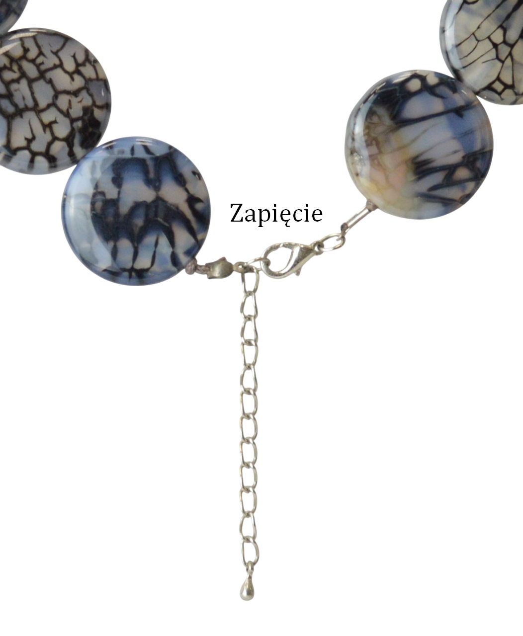 Naszyjnik z kamienia syntetycznego – agatu smoczego to wyjątkowy dodatek, który zachwyca skomplikowanymi wzorami przypominającymi żyły lub łuski smoka, co nadaje mu tajemniczy i magiczny charakter. Elementy w formie okrągłych pastylek w odcieniach szaro-beżowych wprowadzają subtelny, ale wyrazisty akcent do każdej stylizacji. Agat smoczy symbolizuje odwagę, siłę oraz ochronę, a jego unikatowy wygląd sprawia, że naszyjnik jest doskonałym wyborem na prezent dla osób ceniących biżuterię o głębokim, symboliczny znaczeniu. Idealny na Dzień Babci, urodziny czy każdą inną szczególną okazję.