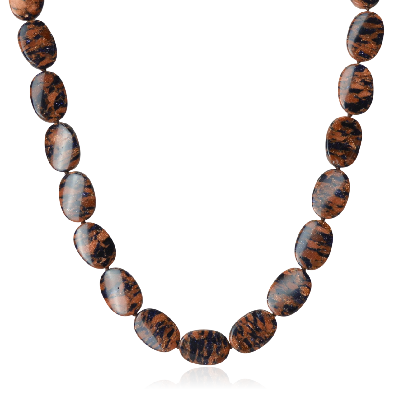 Elegancki naszyjnik z korali w formie owalnych pastylek, wykonanych z piasku pustyni i nocy Kairu – materiałów o niezwykłej historii i zachwycającym blasku. Piasek pustyni oraz noc Kairu to szkło awenturynowe, które powstaje z połączenia masy szklanej i opiłków miedzi, tworząc efekt mieniących się drobinek. Piasek pustyni charakteryzuje się ciepłym, złotobrązowym odcieniem, a noc Kairu zachwyca głębokim granatem, przypominającym rozgwieżdżone niebo. Ten naszyjnik to nie tylko piękny dodatek, ale również wyjątkowy pomysł na prezent, który przyciągnie spojrzenia i doda blasku każdej stylizacji.