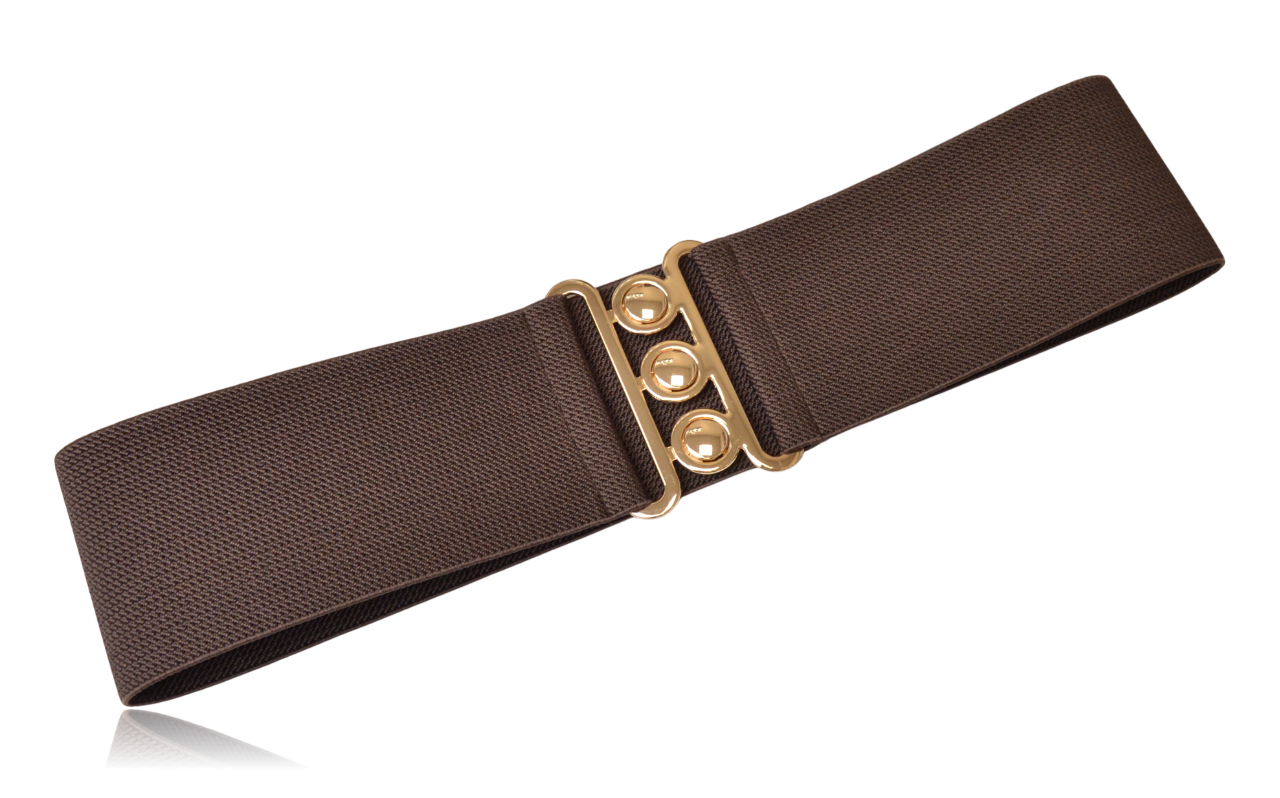 Szeroki pasek na solidnej, elastycznej gumie w eleganckim, czekoladowym kolorze. Posiada szykowną, złotą klamrę. Idealny, aby w sekundę zaznaczyć talię i odmienić Twoją ulubioną sukienkę lub marynarkę.