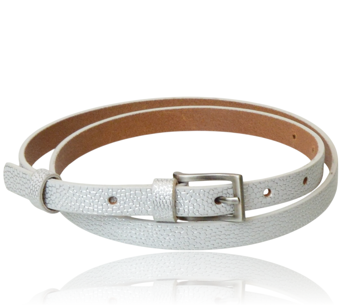 Wąski pasek damski o szerokości 1,3 cm, wykonany z wysokiej jakości skóry naturalnej w kolorze biało-srebrnym z efektownym wzorem łusek. Elegancki dodatek z klasyczną klamrą o satynowym wykończeniu, który doda blasku każdej stylizacji.