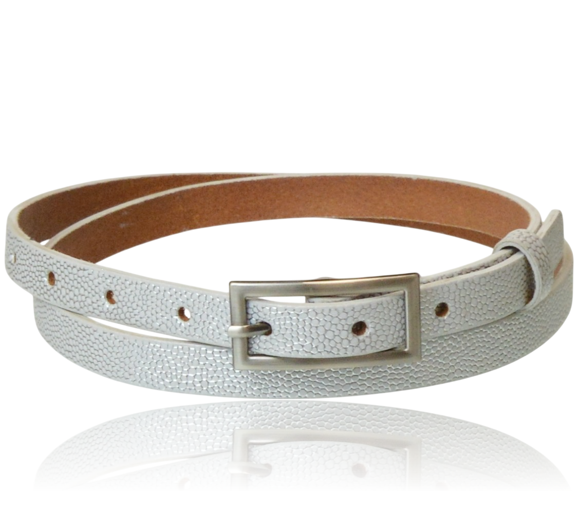 Wąski pasek damski o szerokości 1,3 cm, wykonany z wysokiej jakości skóry naturalnej w kolorze biało-srebrnym z efektownym wzorem łusek. Elegancki dodatek z klasyczną, prostokątną klamrą o satynowym wykończeniu, który doda blasku każdej stylizacji.